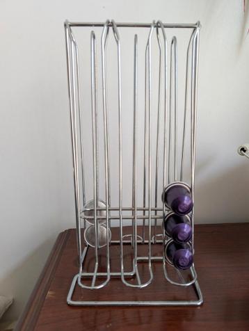 Verschillende huiselijke producten te koop: rekje voor 6 rijen koffiecups, €5. Sorteerbakje voor bijvoorbeeld in de koelkast, 2x. Plastic bakje met zuignappen voor keuken. Sportfles (maar 1x met