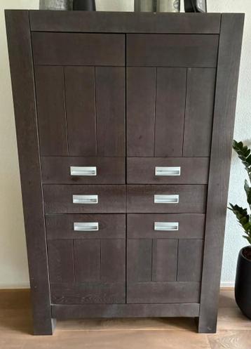 Te koop: donkere houten opbergkast – 100×160×40 cm mooie en stevige opbergkast / buffetkast / servieskast in donker hout. De kast heeft zowel boven- als onderdeuren, een handige lade in het midden en