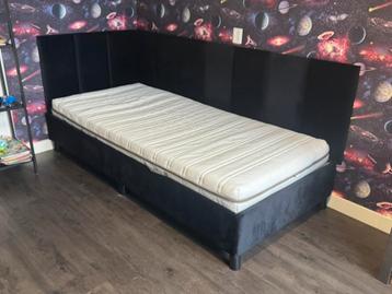 1 persoons bed 90x200 cm. Inclusief matras. Zwart vlours. Bed kan eventueel uit elkaar. Bed is denk ik 1 jaar oud. Matras is nog schoon en netjes komt van ikea. Je kan de hoes wassen.graag z.s.m ophal