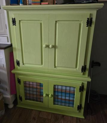 Deze eiken (tv)kast is overgeschilderd in het groen. Originele kleur is zichtbaar in het bovenste binnen gedeelte onderste gedeelte was omgebouwd tot dierenkennel. Maten zijn 140x100x50cm alleen afhal
