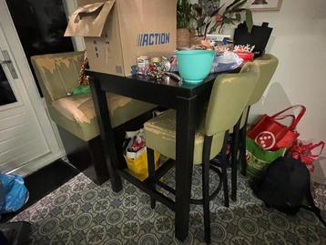 Mooie barset bestaande uit een tafel een bankje en twee krukken. De set is gebruikt, maar nog in goede staat. Behalve de bekleding die is versleten. Als je handig bent of iemand weet die het opnieuw k