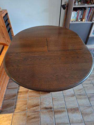 Massief eiken. Klassieke tafel. Diameter ingeschoven 115 cm, uitgeschoven 150 x 115 cm. Er zit nog een onderrand bij (niet op de foto) voor 5 of 6 personen max. Ziet er nog erg goed uit.
