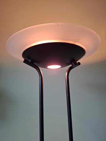 Gratis! Mooie vloerlamp met een glazen kap en een metalen frame. De lamp is dimbaar en kan heel zacht worden gezet, maar ook zodanig dat je er goed bij kunt lezen. Hij functioneert nog helemaal prima.