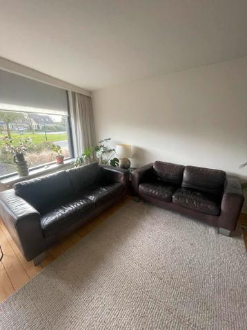 Twee rundlederen banken. Kleur donkerblauw. Zitten nog prima. Kunnen nog best een rondje mee in een studentenkamer oid. Gaan weg omdat wij op 4 maart ons nieuwe bankstel geleverd krijgen. Gratis af te