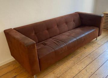 Fijne stevige 3 zitsbank bekleed met bruin nubuck leder. Rvs poten. Breedte 224 cm hoogte 70 cm diepte 87 cm