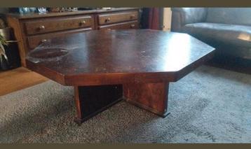 Mooie, gebruikte achtkantige salontafel met een unieke uitstraling. De afmetingen zijn 112 cm x 122 cm x 44 cm. Perfect voor een gezellige zithoek. De tafel heeft gebruikssporen.