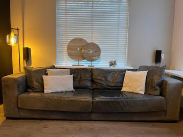 Comfortabele leren bank met bijbehorende hocker. De bank heeft normale gebruikssporen. Breedte: 270 diepte: 94 cm hoogte: 66,5 cm accessoires en beige kussens op de foto zijn niet inbegrepen. De leren