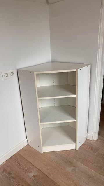 Een witte hoekkast met drie planken. Ideaal voor een wat kleinere kamer. Afmetingen: 85 cm breed 54 cm diep 106 cm hoog