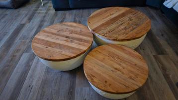 Gratis af te halen 3 ronde salon tafels van verschillende grote. Tafelblad hout kan verwijderd worden voor opslag van spulletjes. Grootste: diameter 80 cm hoogte 40 cm kleinere : diameter 71 cm hoogt