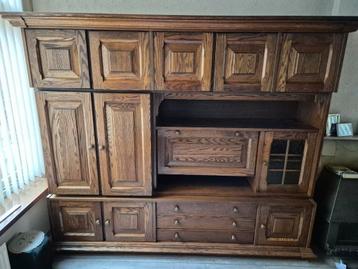Donker bruine vol eiken kast bestaande uit drie delen. Hoogte 190 cm, lengte 235 cm en diepte 60 cm.