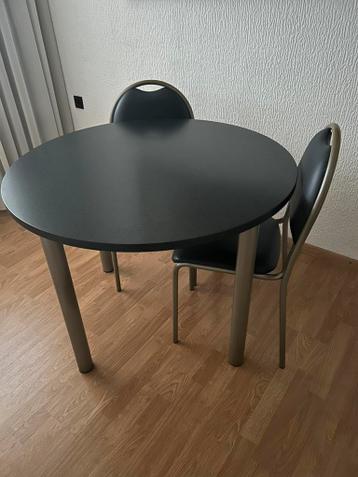 Tafel met twee stoelen, stoelen hebben kleine beschadiging .tafel doorsnee 1,00 cm.
