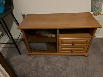 Mooi eikenhouten kastje, ideaal als tv-meubel of bijzettafel. Het kastje heeft lades en een open plank voor extra opbergruimte. Het hout heeft een warme uitstraling en past in verschillende interieurs