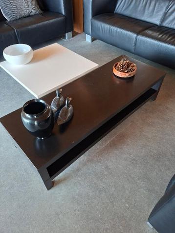 Zwarte salontafel lack van ikea. Heeft gebruikssporen, maar is eenvoudig te schuren en over te schilderen. Of zet er ook iets op :-) met legplank onderop. Afmetingen: lang 1.50Mtr x breed 55cm x hoog
