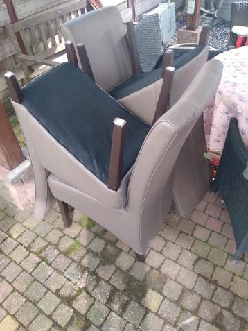 Set van 4 gebruikte fauteuils. De stoelen vertonen slijtage aan het leer, zie foto's. Breedte tussen 50 en 75 cm. Diepte minder dan 75 cm. Materiaal is kunstleer. Gratis afhalen in kerkrade misch