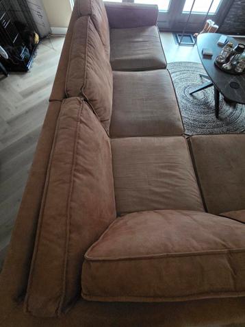 Comfortabele cognac kleurige hoekbank. De bank heeft een lengte van 290 cm aan de ene kant en 225 cm aan de andere kant, met een breedte van 96 cm. De bank is gebruikt en vertoont ligt gebruikssporen