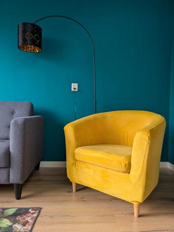 Leuke ikea-fauteuil. Hij is grijs maar verkleurd door de zon, dus heb er zelf een gele fluwelen polyesterhoes omheen gedaan, die krijg je erbij. Zit nog lekker, maar gaat weg vanwege een verhuizing. I