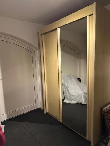 De kledingkast heeft 2 schuifdeuren waarvan 1 met spiegel. De linkerkant heeft een kledingstang van 98 cm en de rechterkant is voorzien van 5 leg planken van 50 cm. De kast hoogte is 225 cm, breedte i