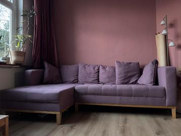 In verband met verandering interieur: leuke paarse hoekbank met houten onderstel. Gebruikt (met kleine poezenschade) maar nog prima geschikt voor een volgende ronde. Bank kan in twee delen uit elkaar.