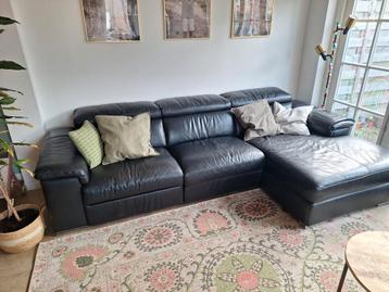 Zwarte leren bank lengte ± 3 meter vaste lange deel ± 1.60M met elektrisch uitschuifbaar onderdeel hoofdsteunen zijn handmatig rechtop te zetten. Bank is gebruikt maar kan prima nog een ronde mee. Le