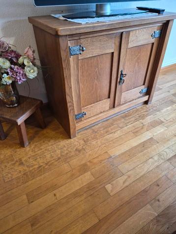 Mooi houten tv-meubel met twee deurtjes. Het meubel is in goede staat en biedt veel opbergruimte. Ideaal voor in de woonkamer of slaapkamer. Afmetingen zijn geschat op minder dan 100cm hoog en breed,