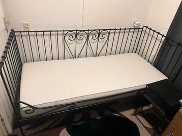 Gratis eenpersoonsbed met metalen frame. Het bed is in gebruikte staat, maar nog prima te gebruiken. Ideaal voor een studentenkamer of logeerkamer. Met matras