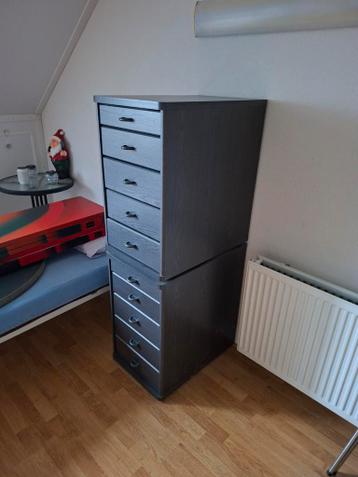 Twee antracietkleurige ladenblokken in zo goed als nieuwe staat. Ideaal voor kantoor of thuis. Zeer netjes en goed onderhouden. Bieden veel opbergruimte. Afmetingen zijn standaard.