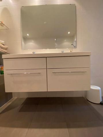 Badkamermeubel met dubbele wasbak en kranen1.20 Breed. Wit. De conditie is gebruikt. Slijtage van schoonmaken rond afvoer.