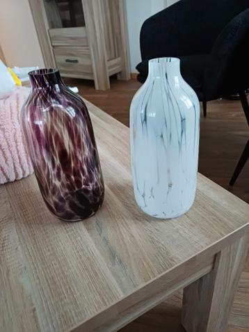Twee kleine glazen vaasjes wit en bruin gevlekt. 25 Cm. Hoog.