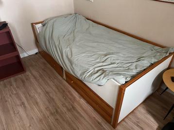 Mooi houten eenpersoonsbed met handige opberglades. Het bed is in gebruikte staat, maar nog prima te gebruiken. Het is zonder beddengoed, met matras en met lattenbodem.