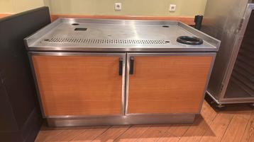 Professioneel keukenblok, in het blok bevinden zich doorgangen voor strook, een prullenbak, opvang goot, opberg ruimte.