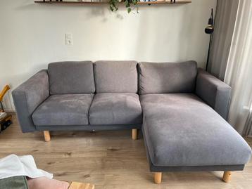 Grijze ikea hoekbank. Hoek kan aan beide kanten gemonteerd worden. Zit nog prima. Hoezen zijn afritsbaar en dus wasbaar. Beide zijkanten hebben opbergvakken. Lengte 235cm diepte zonder hoek 95 cm diep