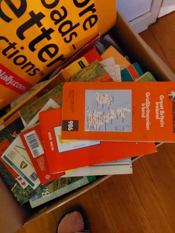 Een doos vol met diverse landkaarten van verschillende landen, variërend in leeftijd van ongeveer 10 tot 30 jaar oud. De kaarten z
