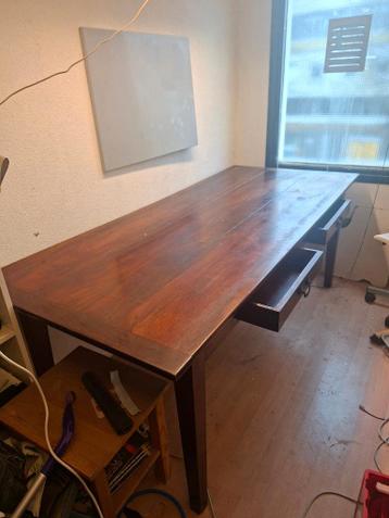 Te koop teak houten tafel met twee lades . Afmetingen 210 cm / 90 cm . Blad is beschadigd zie foto.