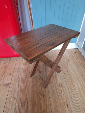 Bijzettafeltje. Ca 45 cm hoog, voor binnen of buiten. Uniek ontwerp en gemaakt om weg te geven deels ook met gratis verkregen hout van een boerderij uit austerlitz.