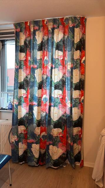 Twee stuks van 125 breed in de plooi. Hoogte 240 cm. Kleuren zijn blauw, rood, roze, wit en zwart met een bloemenmotief