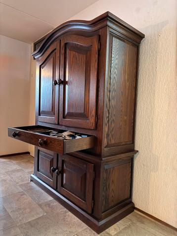 Gratis af te halen! Prachtige, zware massief eiken buffetkast in klassieke stijl. Voorzien van een gebogen kuif, paneeldeuren en een brede lade over de volledige breedte. De kast biedt veel opbergruim