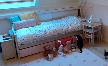 Gebruikt lifetime 1-persoonsbed in whitewash met roze accenten en een handige onderlade. Ideaal voor extra opbergruimte. Gratis af te halen dit weekend. Let op: zonder matras en andere accessoires.