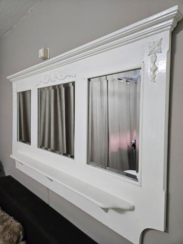 Witte wandspiegel, was eerst een kapstok. Op 4 plekjes komt er een spijkertje door het hout, dit is simpel op te lossen. Spiegel heeft op 1 plekje een barstje, maar dit valt niet op, zit in een hoekje