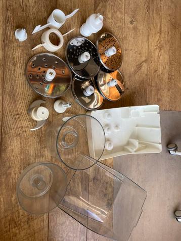 Verschillende onderdelen van de magimix 4100. Eiwitmixers, juliënnesnijder, groentesnijders, parmezaanse kaassnijder, kleine mixbo