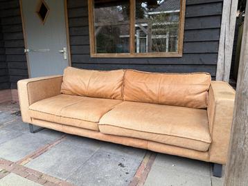 Mooie bruin lederen bank. Mag weg ivm verhuizing. Bank is 235cm breed en ca. 95Cm diep. In 1 zitting zitten twee kleine scheurtjes.