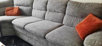 Gratis op te halen: royale hoekbank, bestaande uit een 2-zits, hoek en een 3-zits gedeelte. De bank is bekleed met een gemêleerde grijze stof. Afmetingen: ongeveer 2,6 x 3,2 meter. De bank is in goede