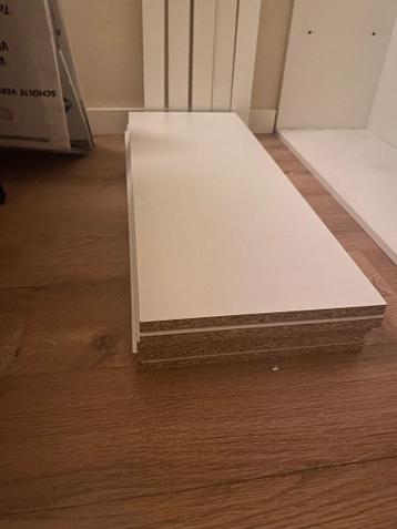Planken meubelplaat wit is boekenkast geweest, 5 keer 91 x 33 cm, 2 keer 242 x 33 cm, zit schroefgaatjes in aan één kant, 1 keer 243,8 x 95,5 cm, schroefgaatjes aan zijkant, 2 keer 93 x 33 cm. Alles 1