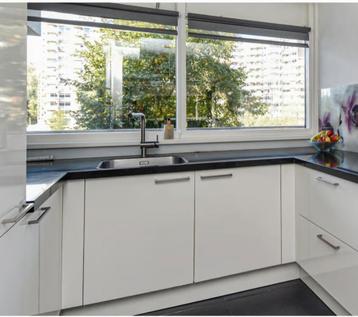 Zwart composiet aanrechtblad. Rechts 110cm (einde gescheurd) midden 191cm (met spoelbak en kraan) links 70cm alleen op 4 maart gratis ophalen!