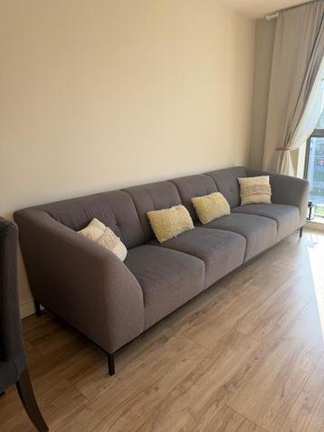 Comfortabele grijze stoffen bank. Geschikt voor vier personen of meer. De bank is in goede staat en heeft een moderne uitstraling. Ideaal voor een gezellige zithoek.