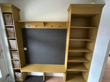 Mooie kapstokmeubel met veel opbergruimte. Ideaal voor de hal of entree. Het meubel bestaat uit een kapstokgedeelte met haken, een bankje om op te zitten en opbergruimte in de vorm van planken en even