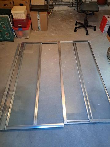 Doucheschuifdeuren met hoekinstap, bestaande uit twee zijden. Inclusief twee profielen voor montage op de wand. Breedte 85 cm, hoogte 185 cm. De instapbreedte (diagonaal) is ongeveer 50 cm. De douched