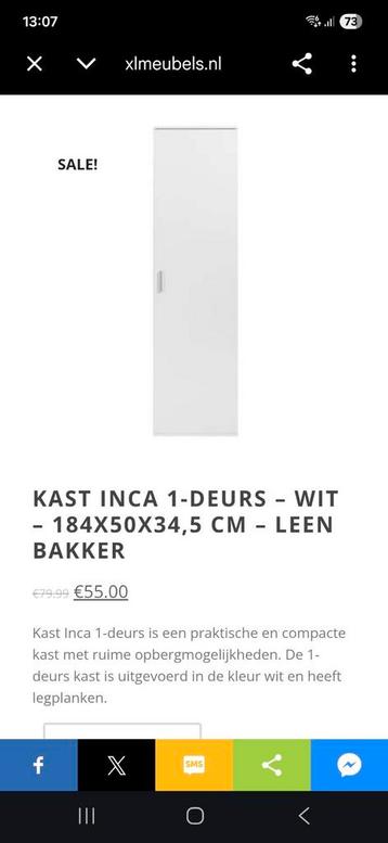 Praktische en compacte witte kast inca met 1 deur en legplanken. Afmetingen: 184x50x34,5 cm. Ideaal voor extra opbergruimte. Nieuw in doos