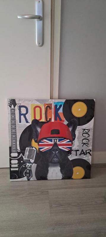 Leuke wanddecoratie canvas met een afbeelding van een hond als rock star. Het canvas is in goede staat en klaar om opgehangen te worden. Ideaal voor de kinderkamer of een muziekliefhebber!