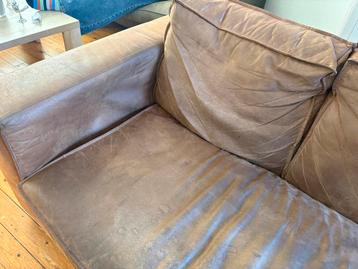 Een stevige, gebruikte bruine leren bank. De bank heeft gebruikssporen en vlekken, maar is verder in goede staat. Ideaal voor een studentenkamer of als budgetvriendelijke optie.