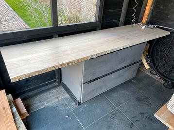 Gratis keukenblokje, ideaal voor onder een overkapping. Het blokje is gebruikt, maar nog in goede staat. Afmetingen blad: 60x255cm. Afmeting blokje: 60diepx120breedx87hoog. Er zijn twee lades en een b